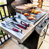 • Side shelf and 13000 BTU side burner for additional cooking flexibility.
