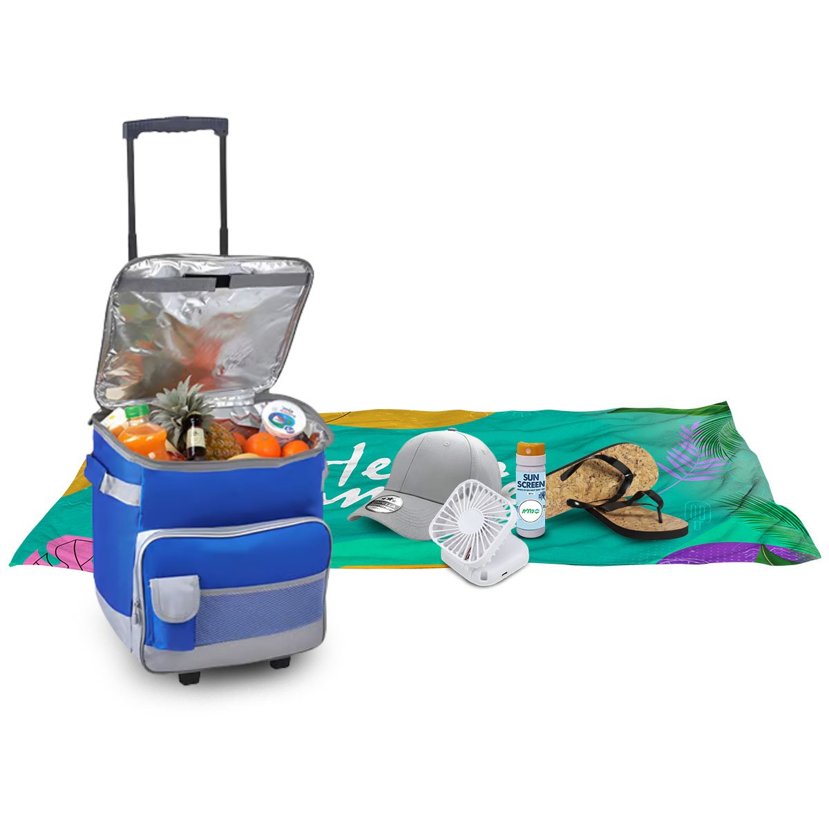 Experience comfort and style with the Summer Must-Have On-the-Go Kit! This set includes a rolling cooler packed with summer treats, a vibrant beach towel, a stylish cap, flip flops, a portable mini fan, and sunscreen – everything you need for the perfect day at the beach or pool. Ideal for picnics, festivals, or seaside escapes, this kit ensures a comfortable and pleasant summer experience.