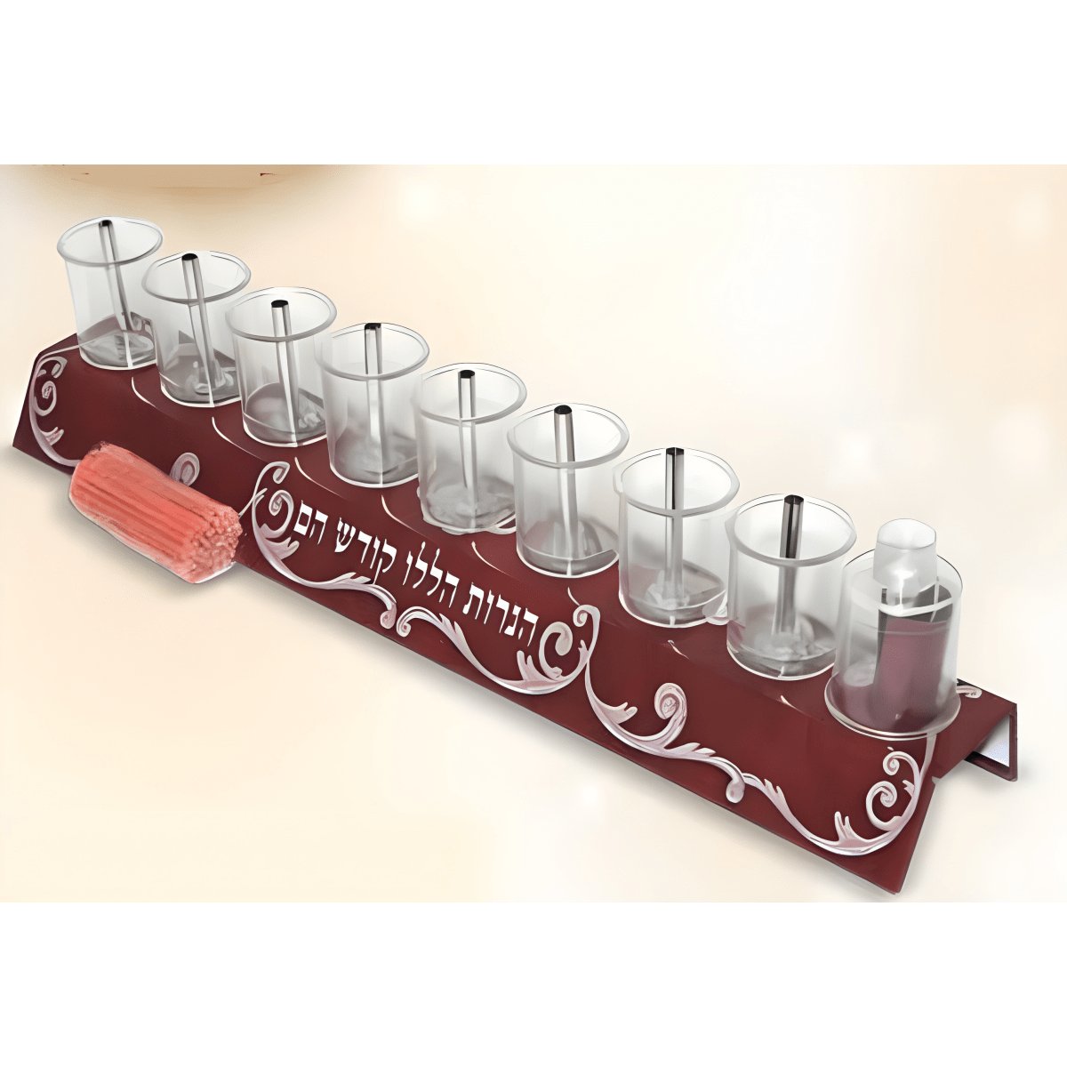 חנוכיית שמן דקורטיבית זו כוללת צינורית מתכת איכותית ופתיליות אור המבטיחות בעירה יציבה ובטוחה. החנוכיה מיועדת להוספה של חמימות ואור לחג החנוכ