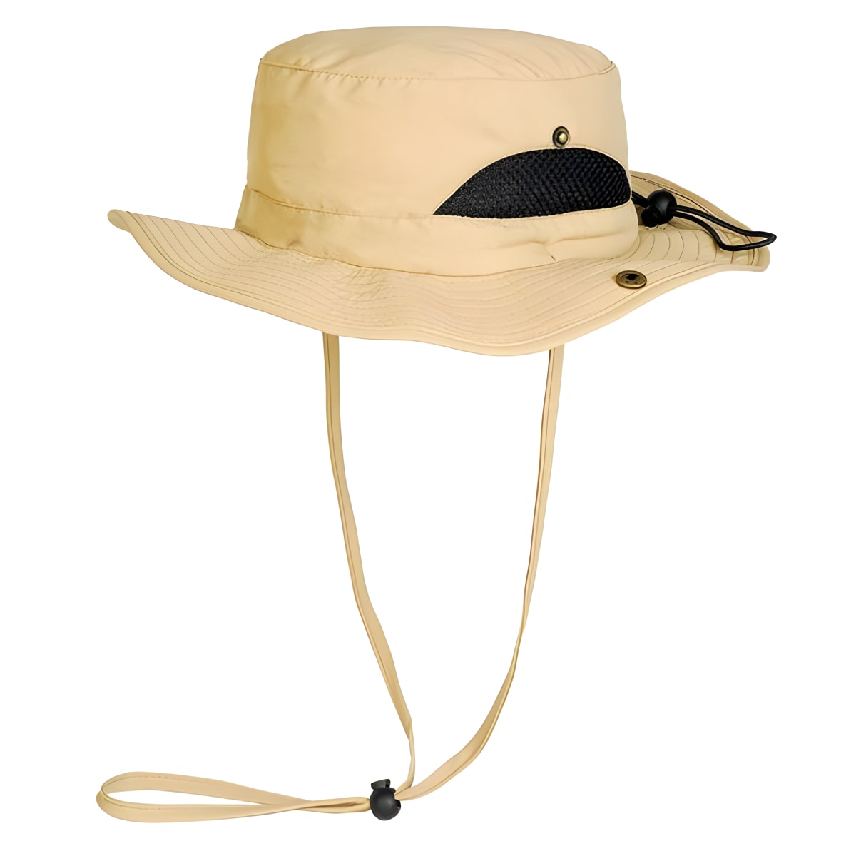 This wide brim cowboy style hat offers perfect protection from the sun and UV rays. Lightweight with adjustable side snaps and a drawstring bead around the head. Includes a drawstring with a bead for the neck or chin and ventilation openings on the sides. Made from 100% nylon, washable, and customizable for branding.