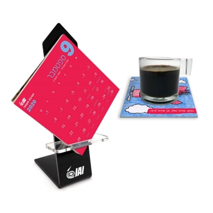 לוח שנה טוטם בעיצוב מודרני עשוי מפלסטיק שחור ושקוף. מכיל 12 כרטיסיות עם הדפסה דו צדדית הניתנות לשימוש כתחתיות לכוסות. גודל: 3X10X11.5 ס"מ.