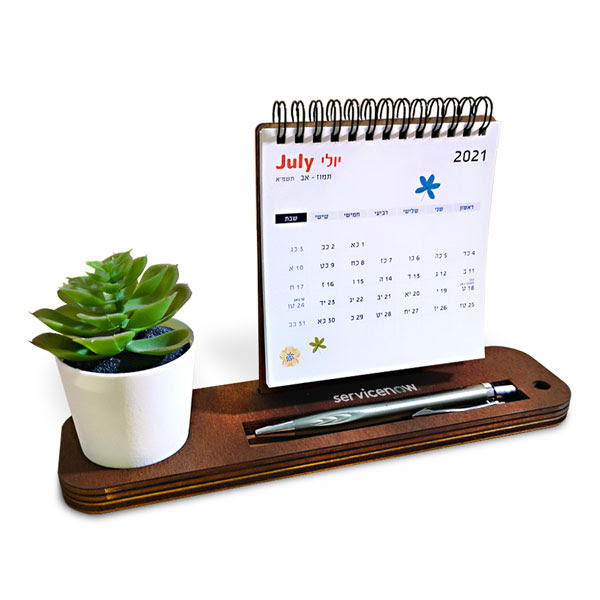 לוח שנה מעוצב מעץ עם עט ותוספות