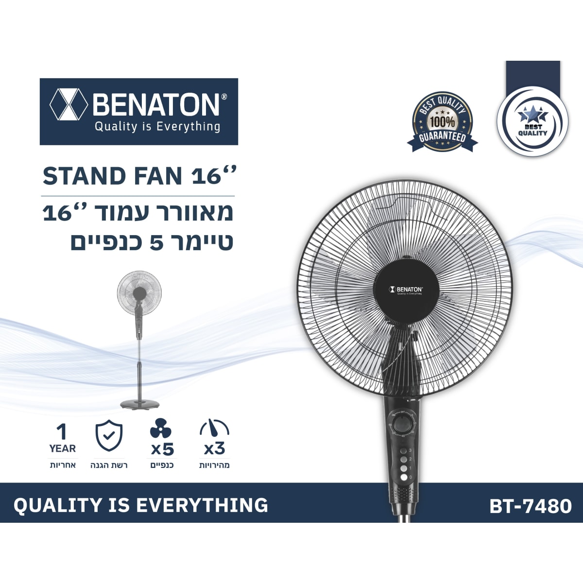 The 16'' BENATON fan with a timer provides pleasant and effective cooling! With 5 blades and a 500W motor power, enjoy a gentle breeze in an