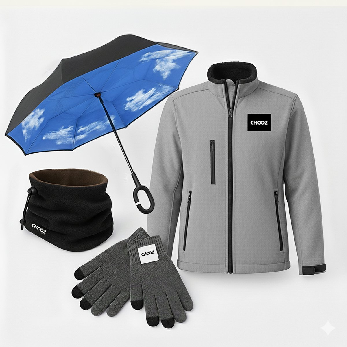 מארז חורף חכם לנסיעות מאפיינים עיקריים: מעיל סופטשל איכותי מעיל עמיד במים ורוח עם אפשרויות מיתוג אישיות. כפפות טאצ' ח