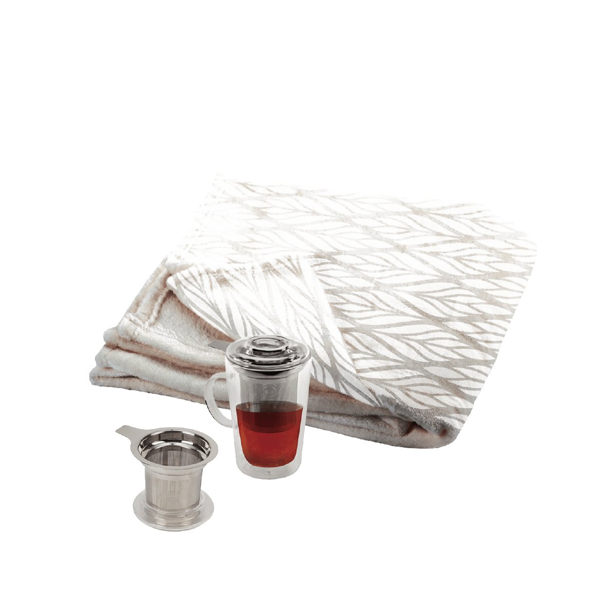 גלה את המארז המושלם לחורף חם ונעים! שדרג את החורף שלך עם שמיכת כירבולית איכותית מבד קורל פליז בגודל 130x150 ס"מ. נוסף לכך, תהנה מספל תה ייחודי עם מסננת, זכוכית דופן כפולה, בנפח 600 מ"ל, כולל מיתוג צבע אחד. אידיאלי למתנה או לפינוק אישי!