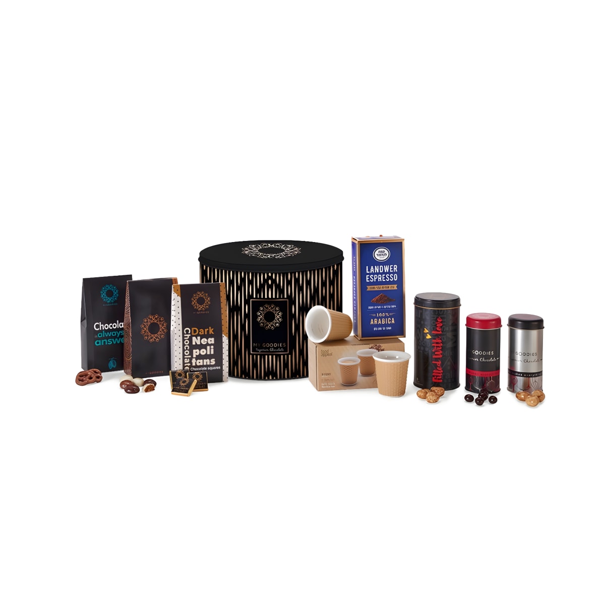 מארז מתנה אוריאן XL – כולל זוג כוסות אספרסו, קפה ושוקולדים יוקרתיים