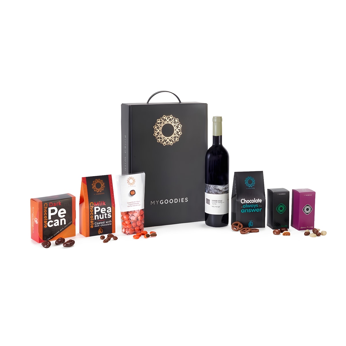 הכירו את מארז המתנה המפואר שלנו המכיל יין אדום קברנה סוביניון מאזור הגליל העליון, ייקב הרי גליל, יחד עם פינוקים מעולים כמו קוביות תפוז מצופות בשוקולד מריר, אגוזי פקאן בשוקולד מריר, בייגלה ומיני בוטנים מלוחים מצופים בשוקולד חלב, וקרנצ'ים לחגי החורף מצופים בשוקולד מכל הסוגים.