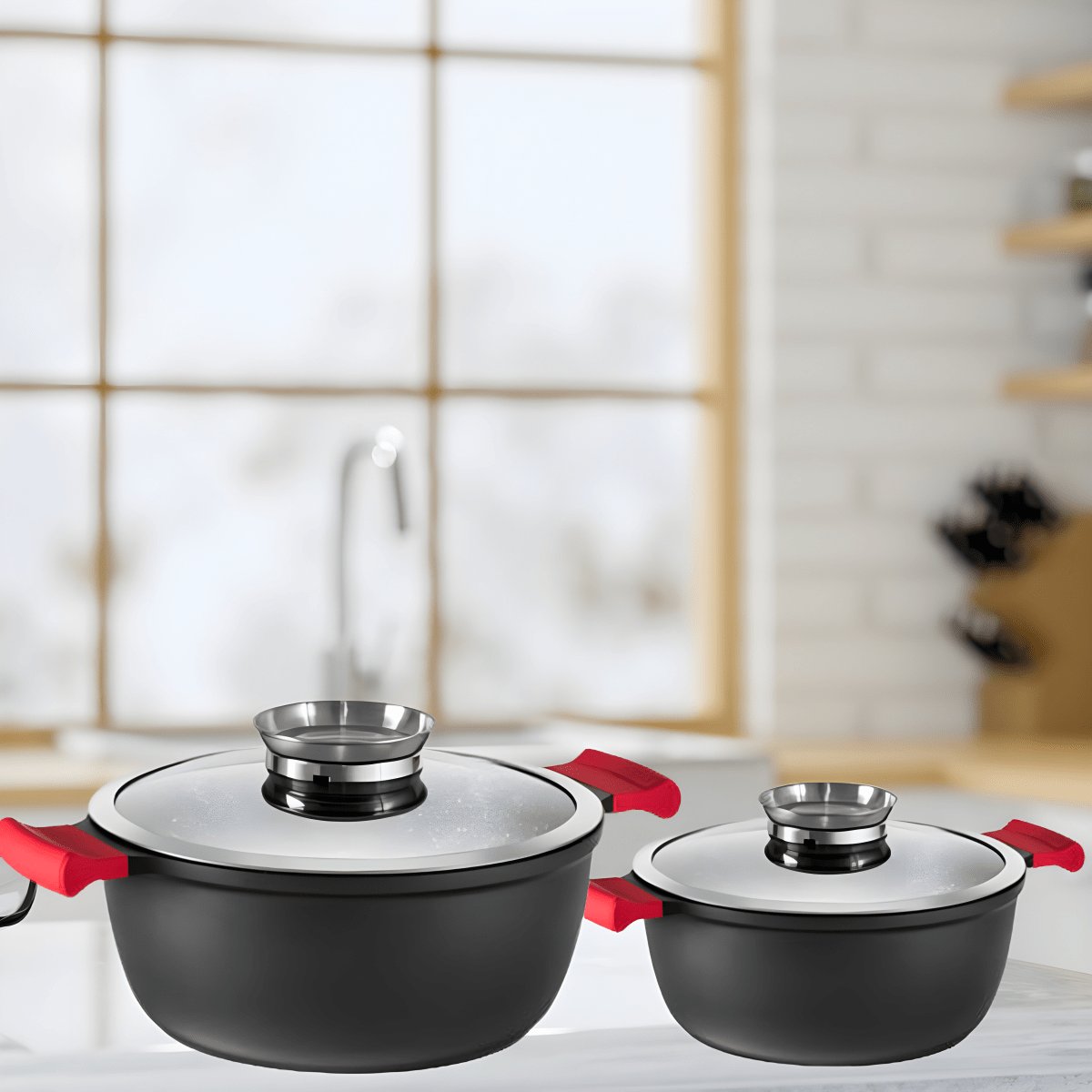 מארז סירים בגדלים 20 ו-24 ס"מ מבית קאפסטוןהסירים מצופים שיש עמיד ויצוק מחומרי אלומיניום איכותיים, עם ידיות סופט טאץ' לנוחות מירבית. מתאים לש