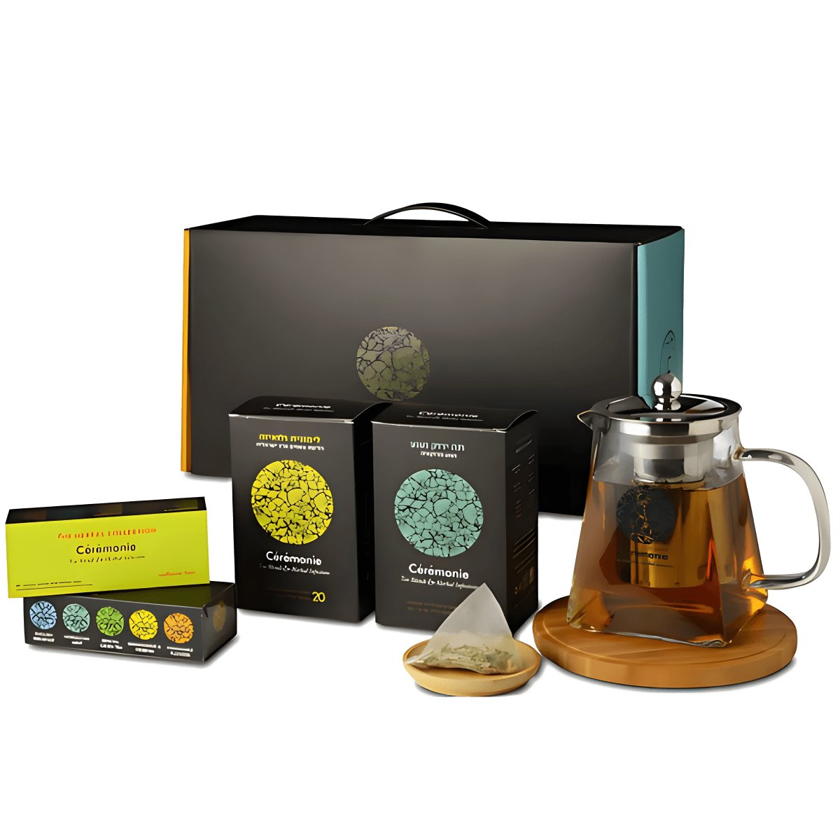 מארז צופית מבית סרמוני המארז מכיל: קנקן זכוכית סרמוני 750 מ"ל מארז 20 שקיקי פירמידה - לימונית ולואיזה מארז 20 שקיקי פירמידה