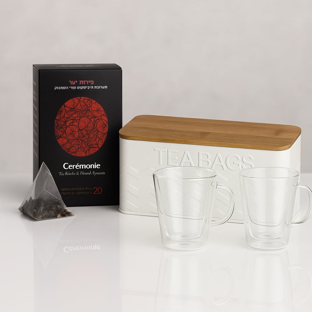 המארז המושלם מתנה עסקית המהווה פתרון אידיאלי לרגעים של חום ונוחות. עם זוג כוסות דופן כפולה 250 מ"ל, קופסת תה מתכת 8.0*8.5*20.5 ס"מ
