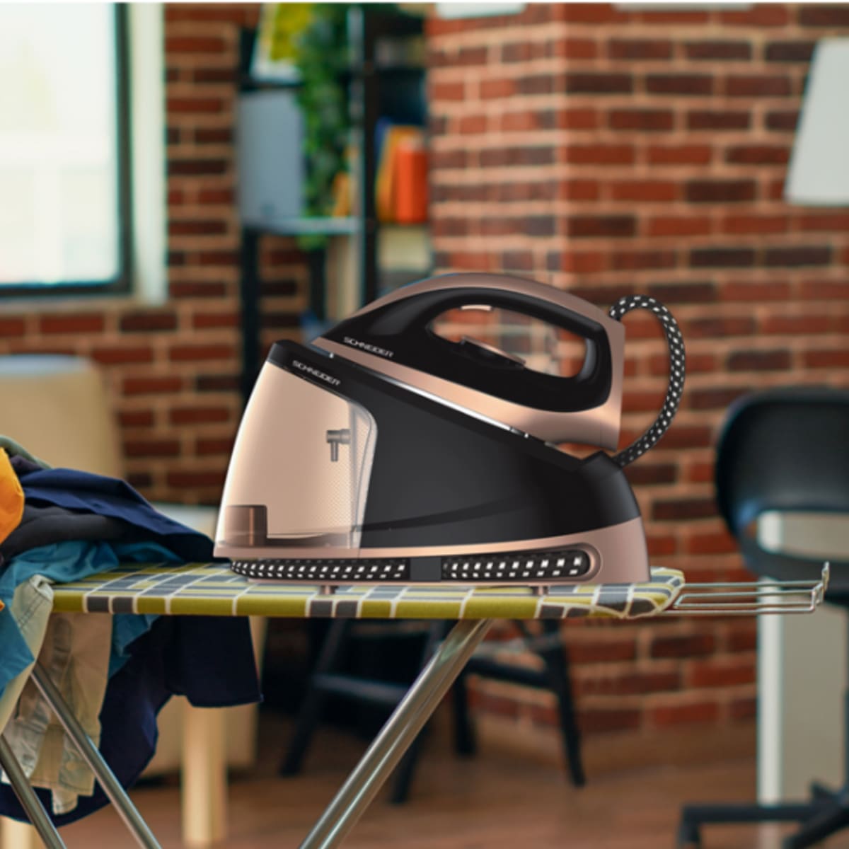 מגהץ קיטור מקצועי 2400W של שניידר תכונות מנוע עוצמתי לגיהוץ מושלם מיכל מים נשלף בקיבולת 1.2 ליטר למילוי תוך כדי פעולה לחץ קיטור 5 בר ותפוקת