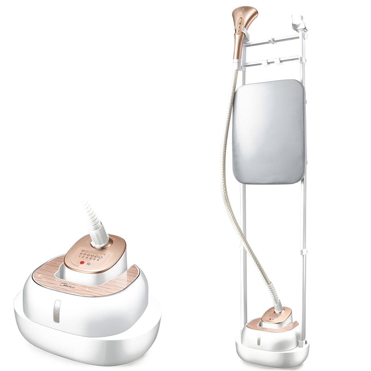 מגהץ קיטור עומד מבית MIDEA מעוצב למקצוענים ולאוהבי אופנה, מתאים לשימוש בבתי מלון ולשימוש אישי.