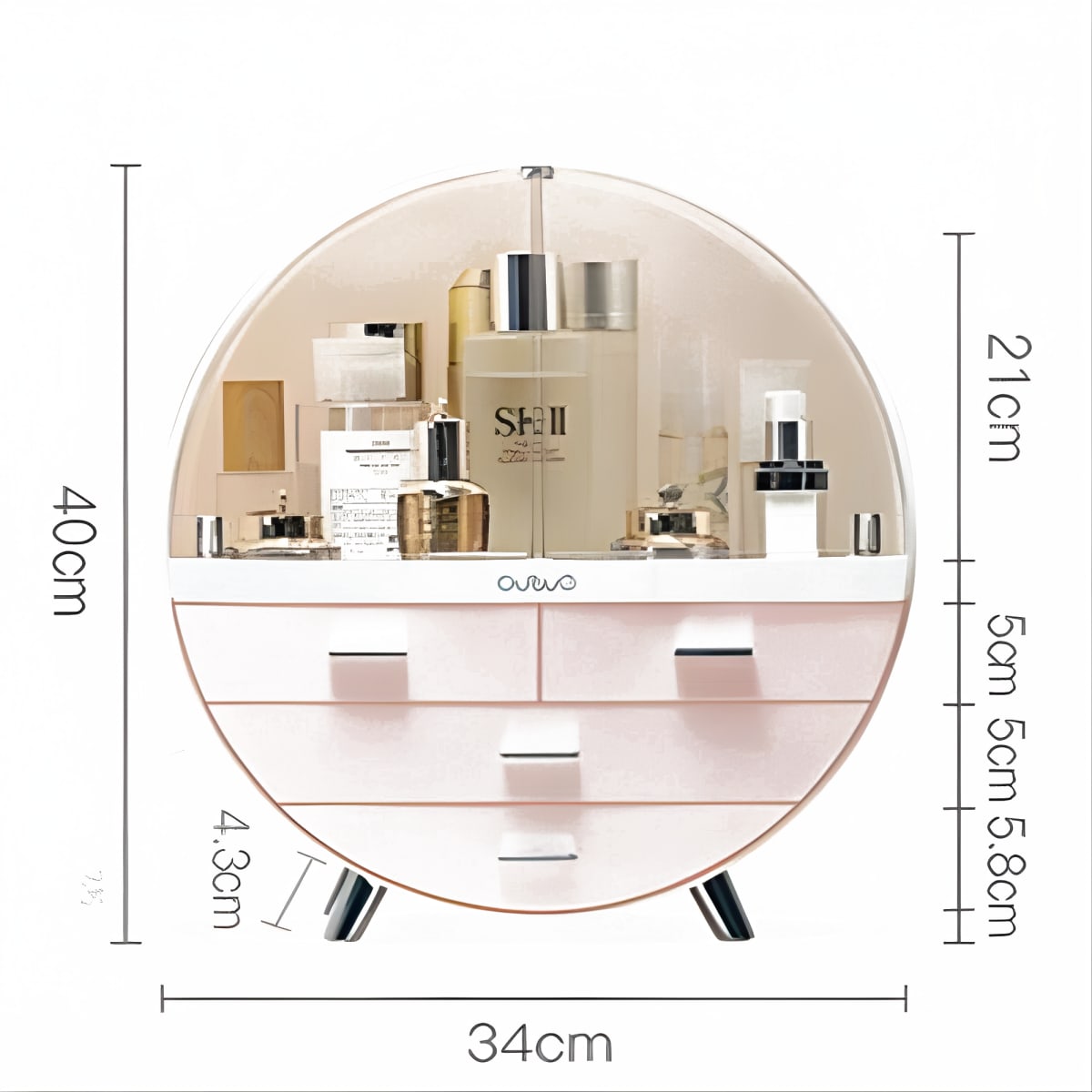 מדף קיר עיגולי מודרני המושלם לאחסון וארגון מוצרי טואלטיקה באופן אסתטי. בעל עיצוב מינימליסטי וחומרים איכותיים המשדרים יוקרה. מתאים לשימוש בחד