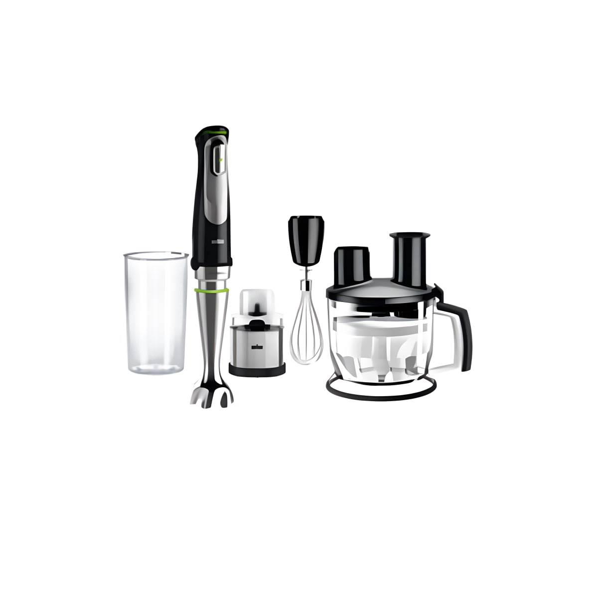 מגיע עם כוס מדידה 600 מ"ל, מטחנת תבלינים וקפה, ומעבד מזון בנפח 1.5 ליטר הכולל אביזרים לקיצוץ, פריסה, גירוד, הקצפה וערבול.