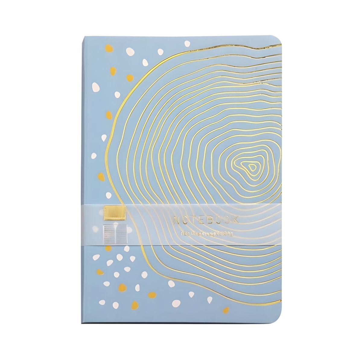 נוח לשימוש יומיומי ועיצוב ייחודי - מחברת תכלת מעוצבת עם מערבולת צהובה. אידאלית לכתיבה יצירתית או רישום הערות במהירות. בגודל פרקטי 14.7X21 ס"