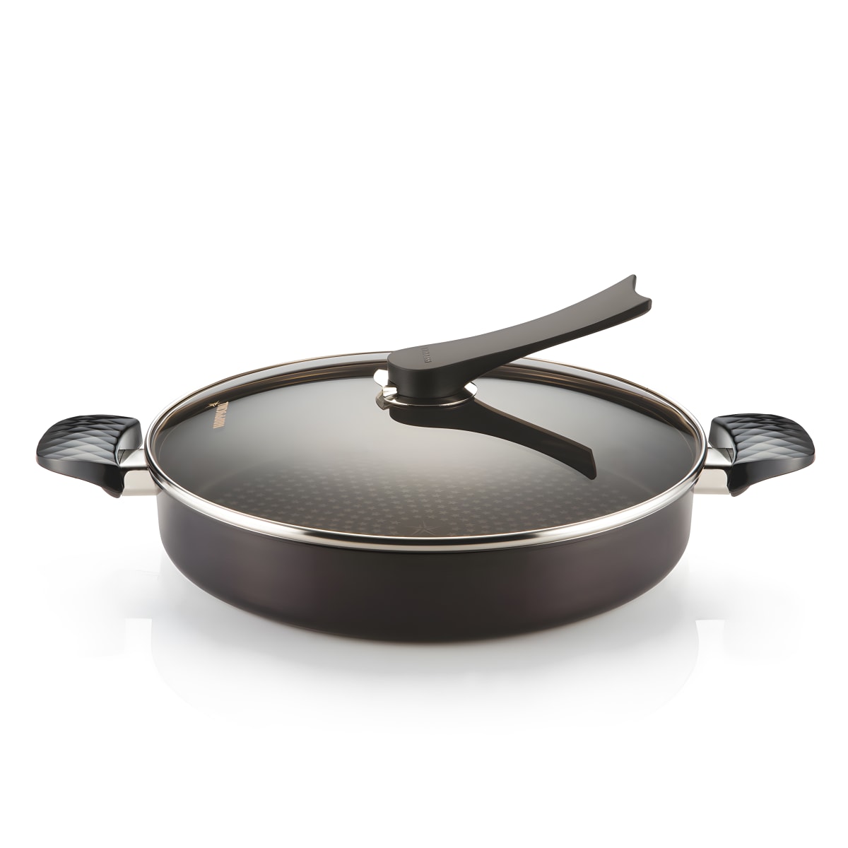 This modern, high-quality stainless steel pan includes a transparent glass lid for convenient and safe cooking. Designed for daily use, it maintains perfect flavors and saves energy with its even heat distribution.