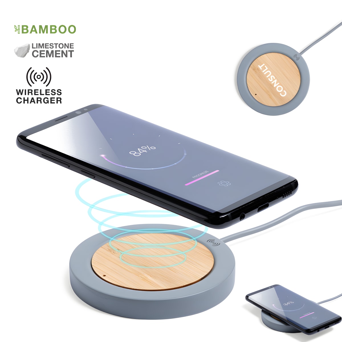 מטען אלחוטי מבטון עם במבוק, מושלם כמטען דקורטיבי למשרד. עיצוב המשלב בטון ובמבוק מעניק תחושה מודרנית וטבעית. מתאים לטעינה מהירה של 5W ומציע אפשרות להדפסת לוגו אישית.