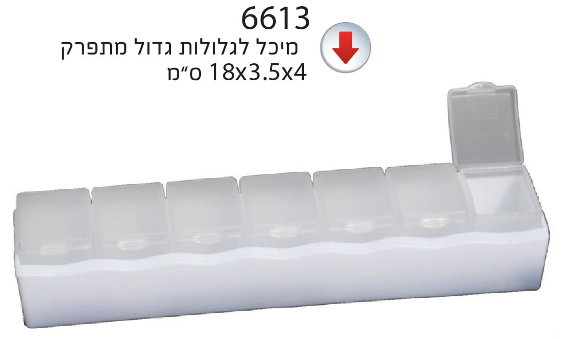 מיכל לגלולות שבועי, המאפשר סידור נוח של התרופות במשך השבעה ימים. 7 קופסאות אישיות נשלפות מסייעות לשמור על סדר וארגון. מידות: 18X4X3.5 ס”מ. צ