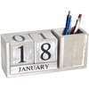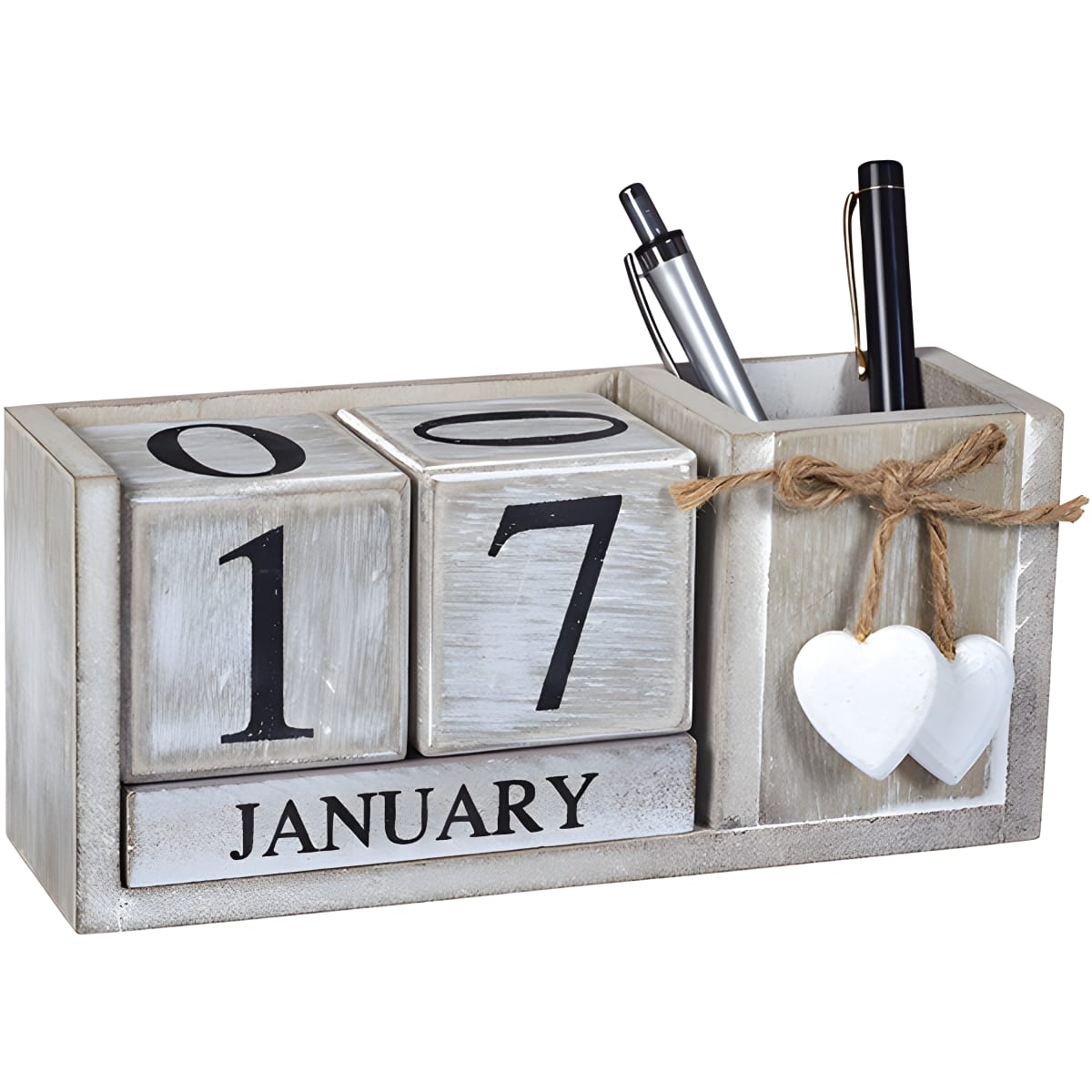 מעמד שולחן עם תאריכון קוביות עץ וכוס לעטים