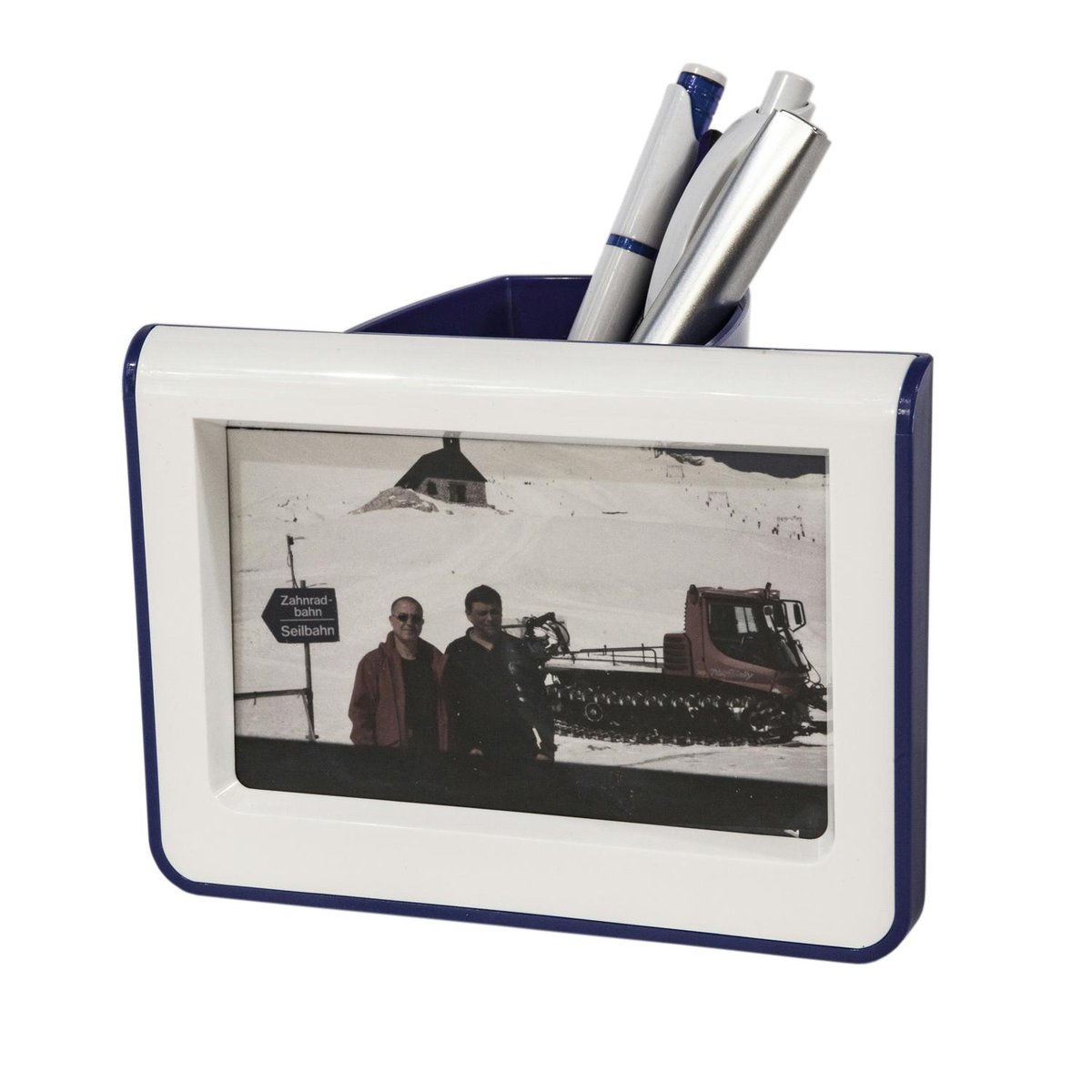 Enhance your workspace with a premium desktop pen holder featuring a slot for a personal picture or advertisement. This holder not only adds