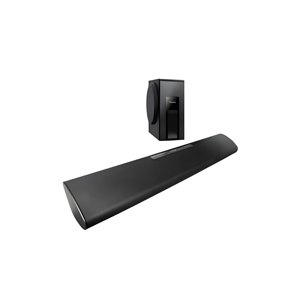 Experience powerful audio with PANASONIC's 2.1 channel soundbar system, delivering an impressive 120W RMS. The speaker can be placed on a sh