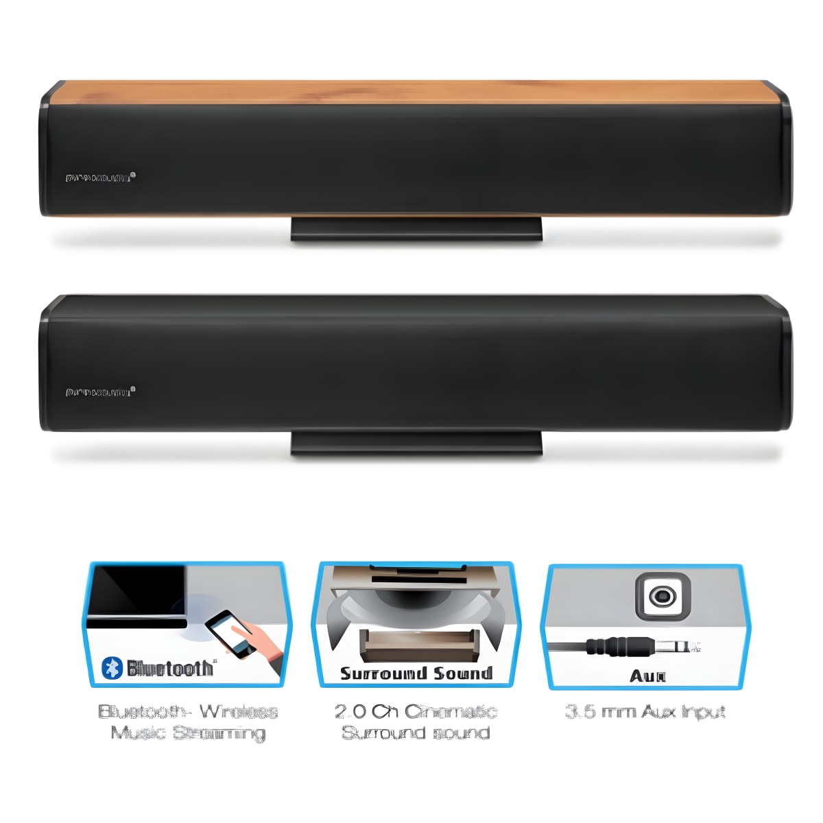 Enhance your listening experience with a powerful 25W portable Bluetooth soundbar. Enjoy cinema-quality sound with the 2.0 audio projector, delivering rich audio with impressive bass. Its portable design allows up to 8 hours of use with a rechargeable lithium battery. Offers versatile connections: Bluetooth for wireless streaming, 3.5mm input for wired connectivity, and USB input for direct music playback. Simple and quick installation lets you start using within minutes. Choose designs in wood or black finish to elevate your home comfort and style.