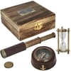 גלו את סט הוינטג' היוקרתי הכולל מצפן איכותי בקוטר 7.50 ס"מ, שעון חול מרהיב בגובה 7 ס"מ עם זמן ריצה של חצי דקה, וטלסקופ מעוצב שאורכו במצב סגו