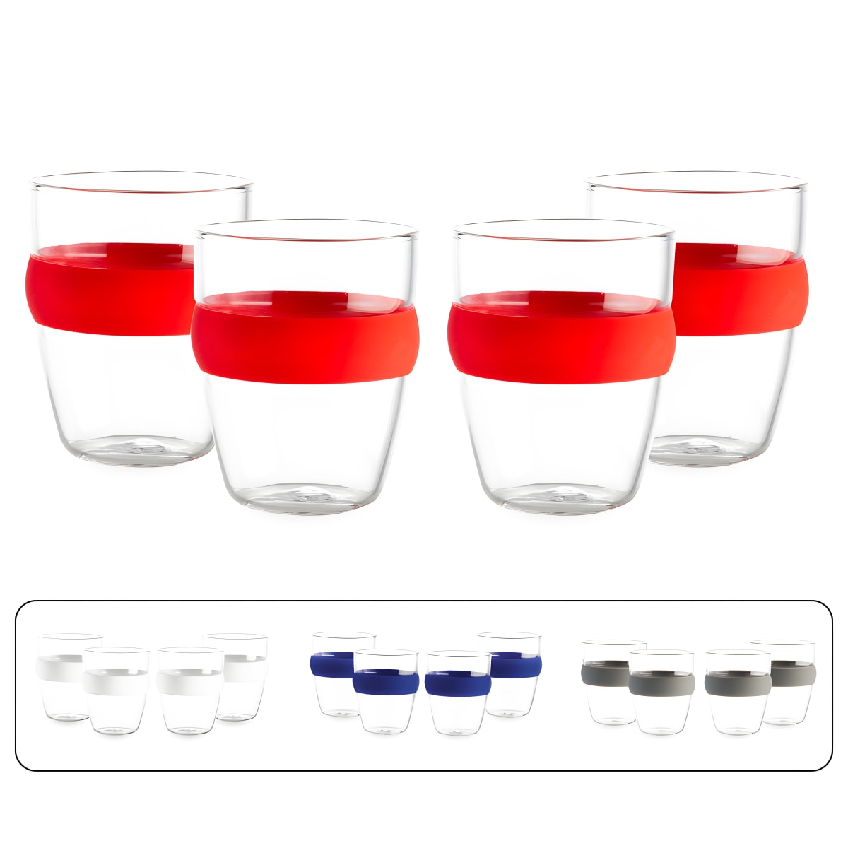 העניקו נוחות ליומיום שלכם עם סט של 4 כוסות זכוכית מעוצבות, עם חבקי סיליקון צבעוניים להוספת יופי ונוחות לאחיזה.כוסות זכוכית עמידות לשימוש במד