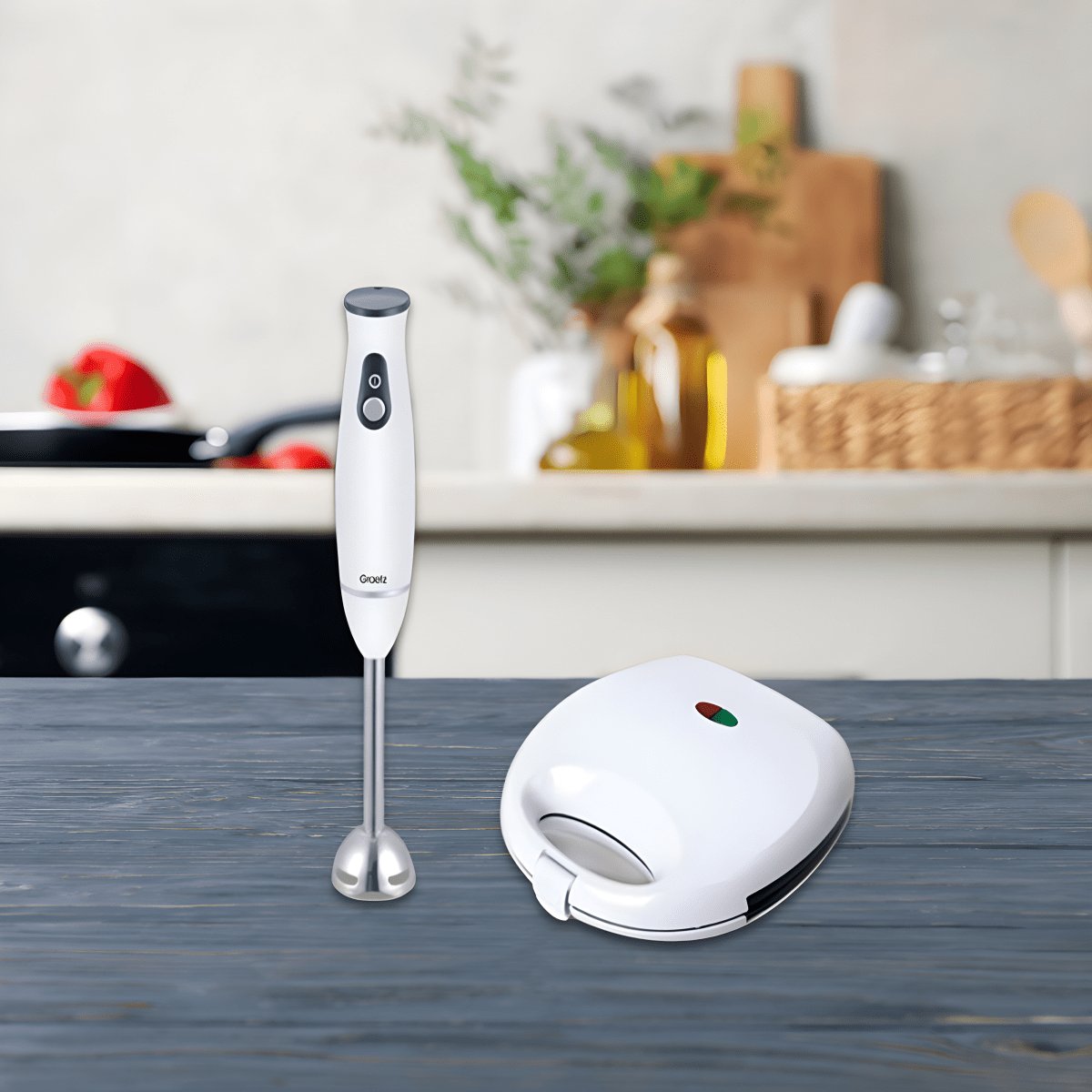בלנדר מוט עוצמתי: 300W מתאים במיוחד להכנת מרקים, רטבים ומזון לתינוקות. עשוי נירוסטה עמידה.טוסטר פסים איכותי: 750W עם משטחי קלייה טפלון ונורת