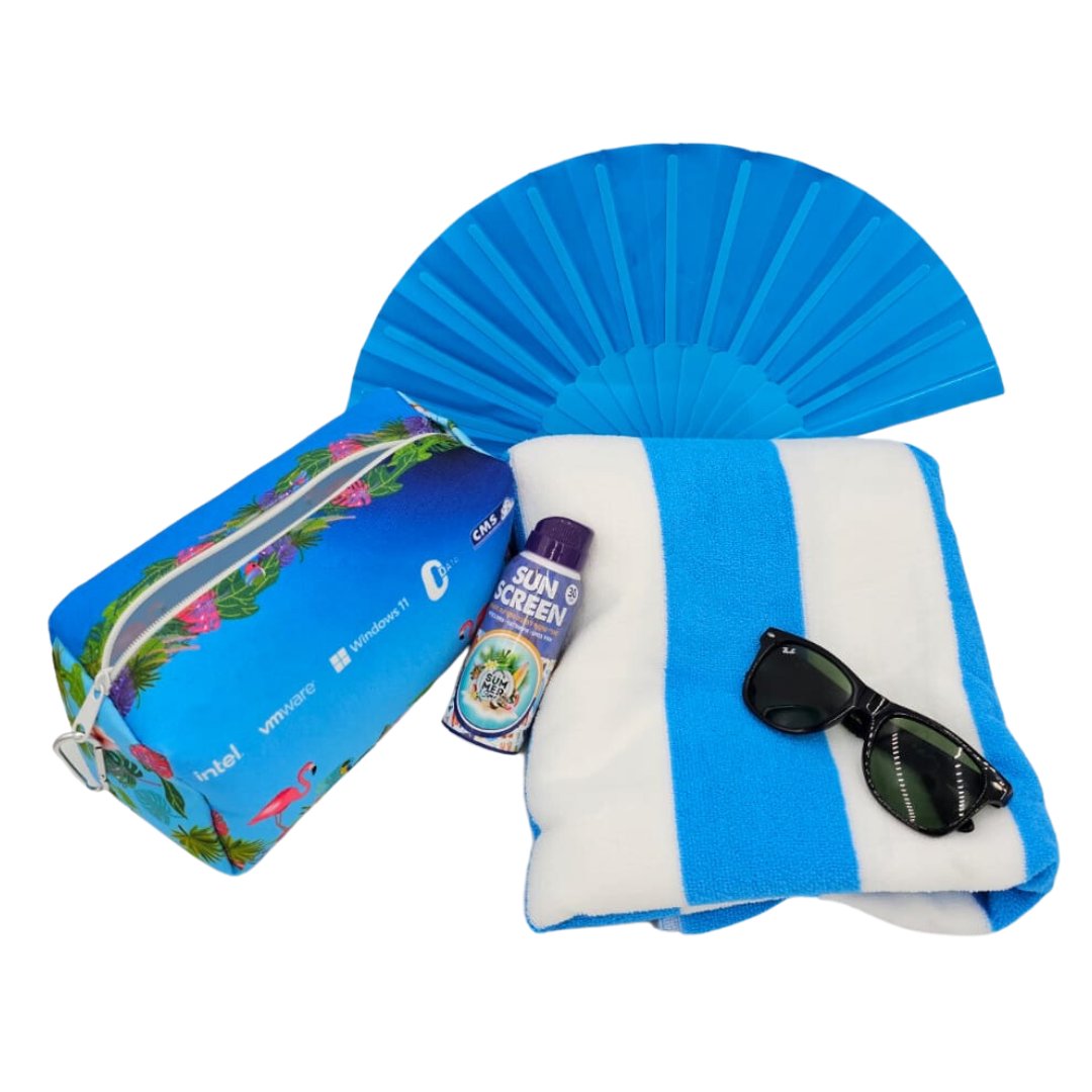 Beach towel, fan, sunglasses, sunscreen and a branded toiletry bag - the perfect set for any beach or pool outing.