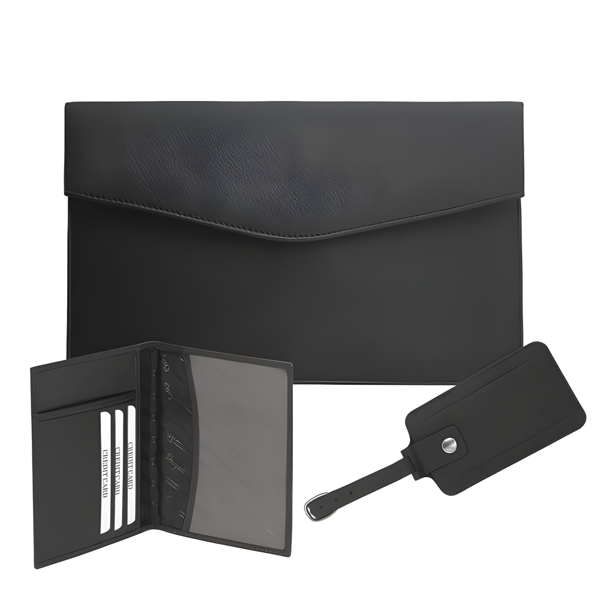 Discover the perfect luxury leather travel set, featuring three matching items in color. The luggage tag, passport cover, and document holde