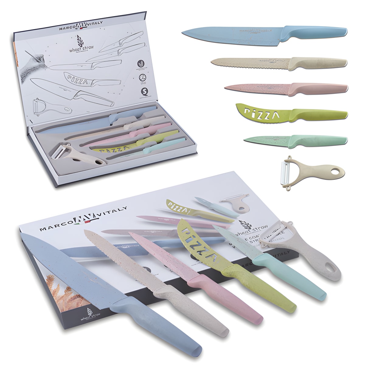 סט סכינים יוקרתי הכולל 6 סכינים צבעוניים עם ידיות מסיבי קש חיטה – חומר אקולוגי ועמיד. הלהבים מעוצבים בציפוי דמוי שיש ומגיעים באריזת מתנה מהו