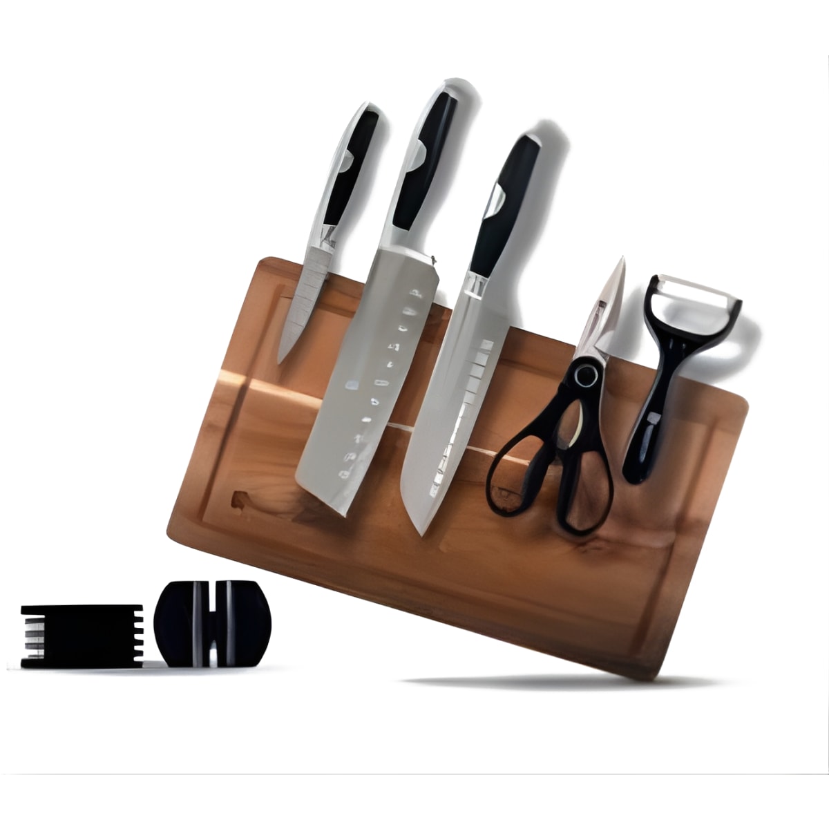 חווית חיתוך מושלמת עם סט סכינים מקצועיות המגיע עם מעמד עץ אופנתי. הסט כולל סכיני שף, סכין לחיתוך לחם ומספריים קולינריים, כל כלי מעוצב בקפידה