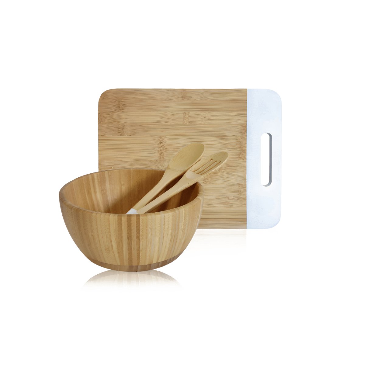 הביאו סטייל למטבח שלכם עם סט סלט יוקרתי מבמבוק, כולל 4 חלקים: קערת סלט, קרש חיתוך ושתי כפות ערבוב. קערה עם קוטר עליון של 24.5 ס"מ, קוטר תחתון 18 ס"מ, גובה 11.5 ס"מ ועובי 1 ס"מ. קרש חיתוך בגודל 33X26X1.3 ס"מ. כפות ערבוב באורך של 30 ס"מ. מושלם כמתנה בקופסה מרהיבה.
