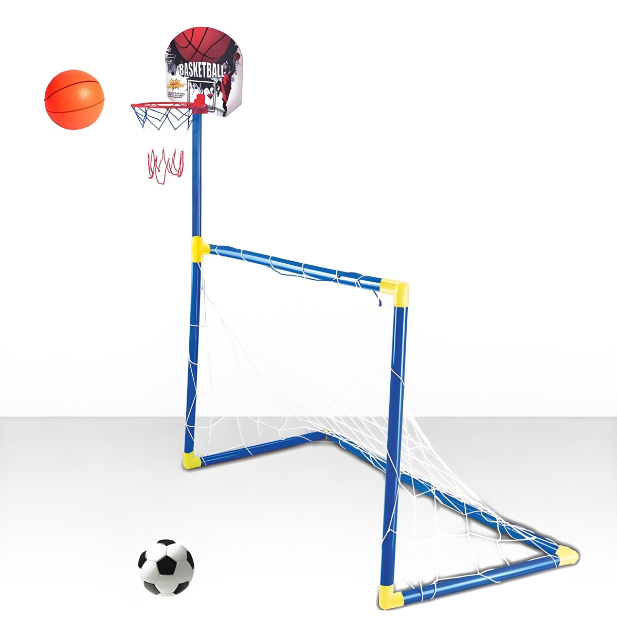 תכולת הסט: 1. שער מפלסטיק קל להרכבה, רוחב 92 ס”מ, גובה 63 ס”מ, עומק 56 ס”מ, כולל רשת וכדורגל מפלסטיק בקוטר 10 ס”מ. 2. מתקן סל המתלבש על הבסיס של שער הכדורגל, בגובה 143 ס”מ מהרצפה, כולל רשת לסל וכדורסל מפלסטיק בקוטר 10 ס”מ. 3. משאבה לניפוח הכדורים.