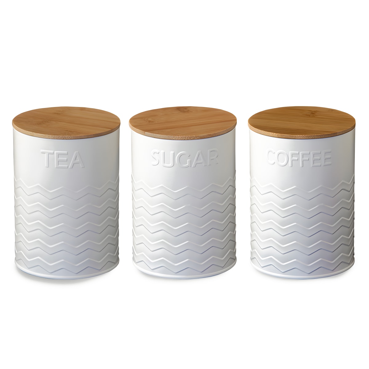 סט אלגנטי המכיל שלוש קופסאות מתכת איכותיות לאחסון תה, קפה וסוכר. הציפוי הפנימי מותאם למזון, מה שמשפר את אחסון המזון שלך.כולל מכסה במבוק אטום