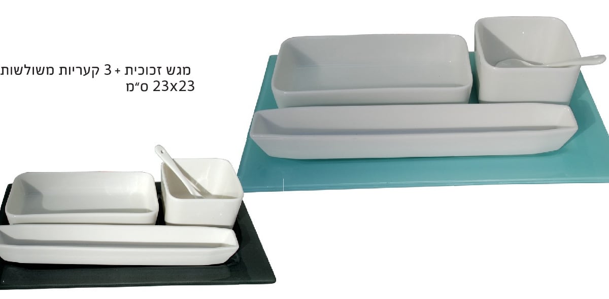 מתנה עסקית אידיאלית המספקת תחושת יוקרה לעובדים וללקוחות. השפעה חזקה בזכות הסט המפואר של 3 קעריות קרמיקה פורצלן במגש זכוכית מלבני בגודל 23x23
