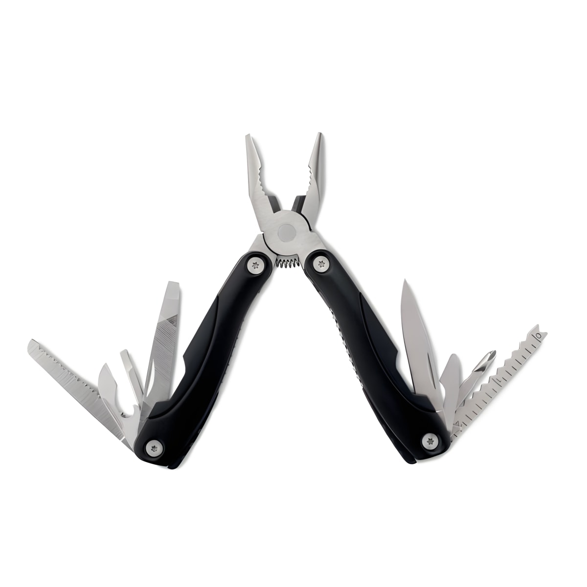סכין רב-כלי מתקפל מנירוסטה עם 9 פונקציות שימושיות בשילוב עם כיסוי פוליאסטר 600D עמיד. אידיאלי לקמפינג, טיולים ופעילויות חוץ.