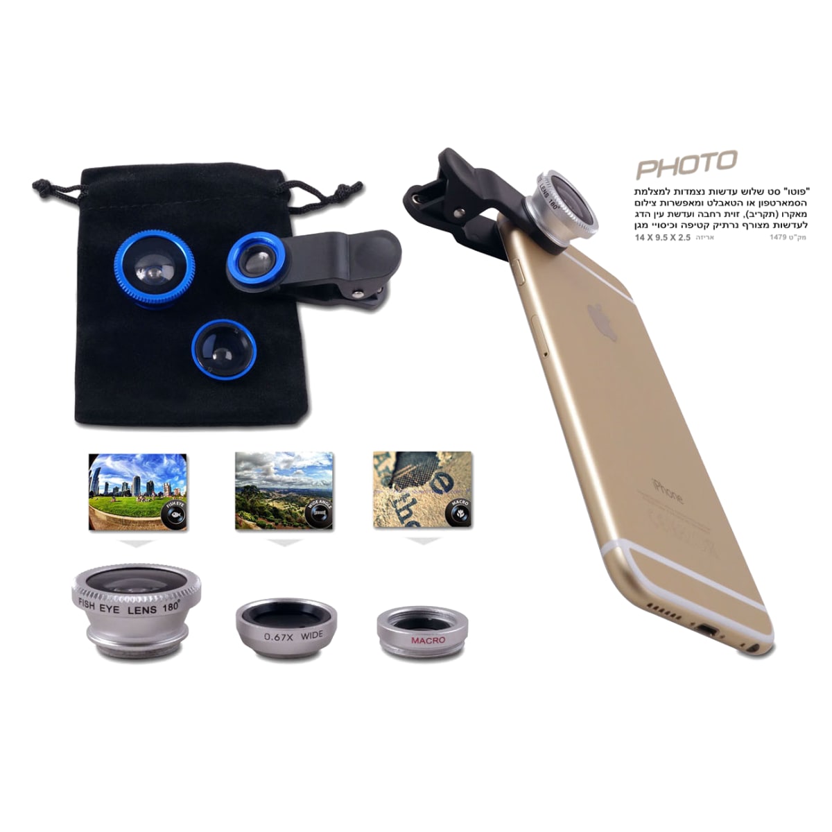 High-quality smartphone lens set including fisheye, wide-angle, and macro lenses. Capture stunning moments and create breathtaking photos easily. Made from quality materials, portable and user-friendly. Dimensions: 14x9.5x2.5 cm.