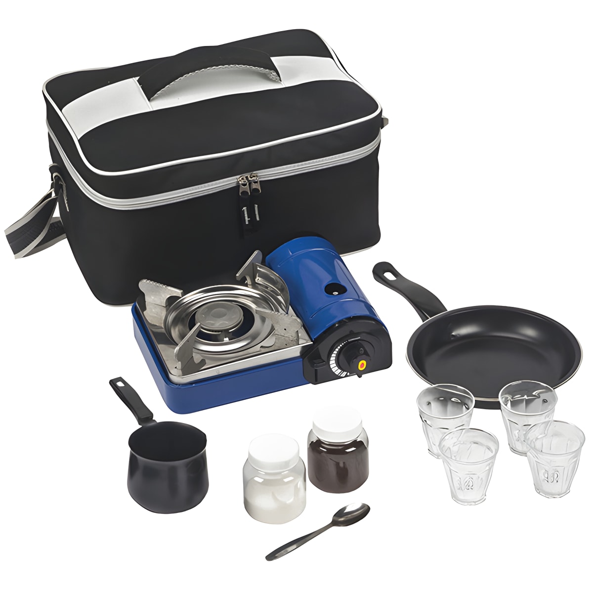 Kickstart your gourmet outdoor cooking with the ultimate set! Includes 4 coffee cups, 2 storage boxes for coffee and sugar, a spoon, a gas s