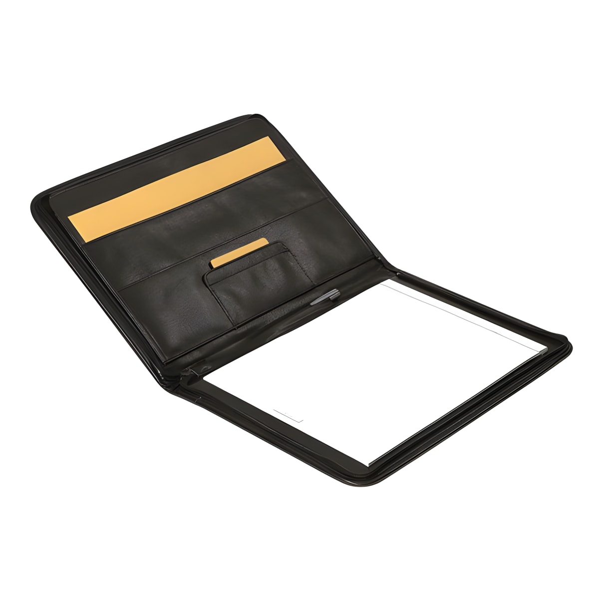 פולדר איכותי מדמוי עור בגודל A4 עם רוכסן. כולל מכתביית נייר, לולאת עט ונרתיק לאחסון כרטיסים. אידיאלי לפגישות עסקים.