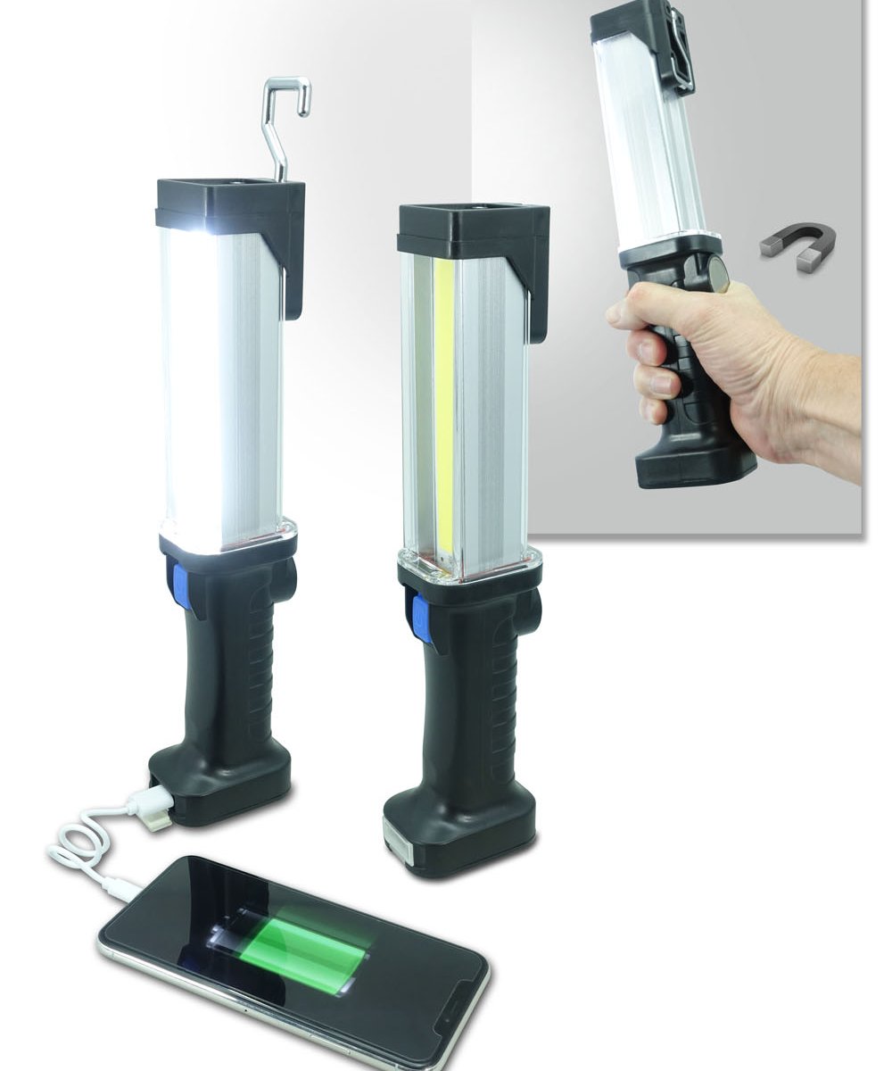 פנס COB חזק עם 63 נוריות, כולל מטען נייד 4000mAh, מגנט חזק ומתלה מתקפל. מגיע עם כבל טעינה תלת ראשי ארוך. מידות: 31x7.5x5.5 ס"מ.