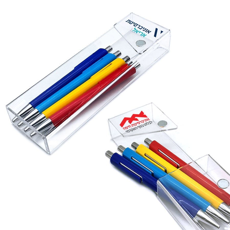 קלמר פלסטיק שקוף קשיח עם סגירה מגנטיתכולל ארבעה עטים מתחלפים בכל צבעמידות: 17X6X3 ס"מאפשרות למיתוג בצבע אחד על גבי הקלמר