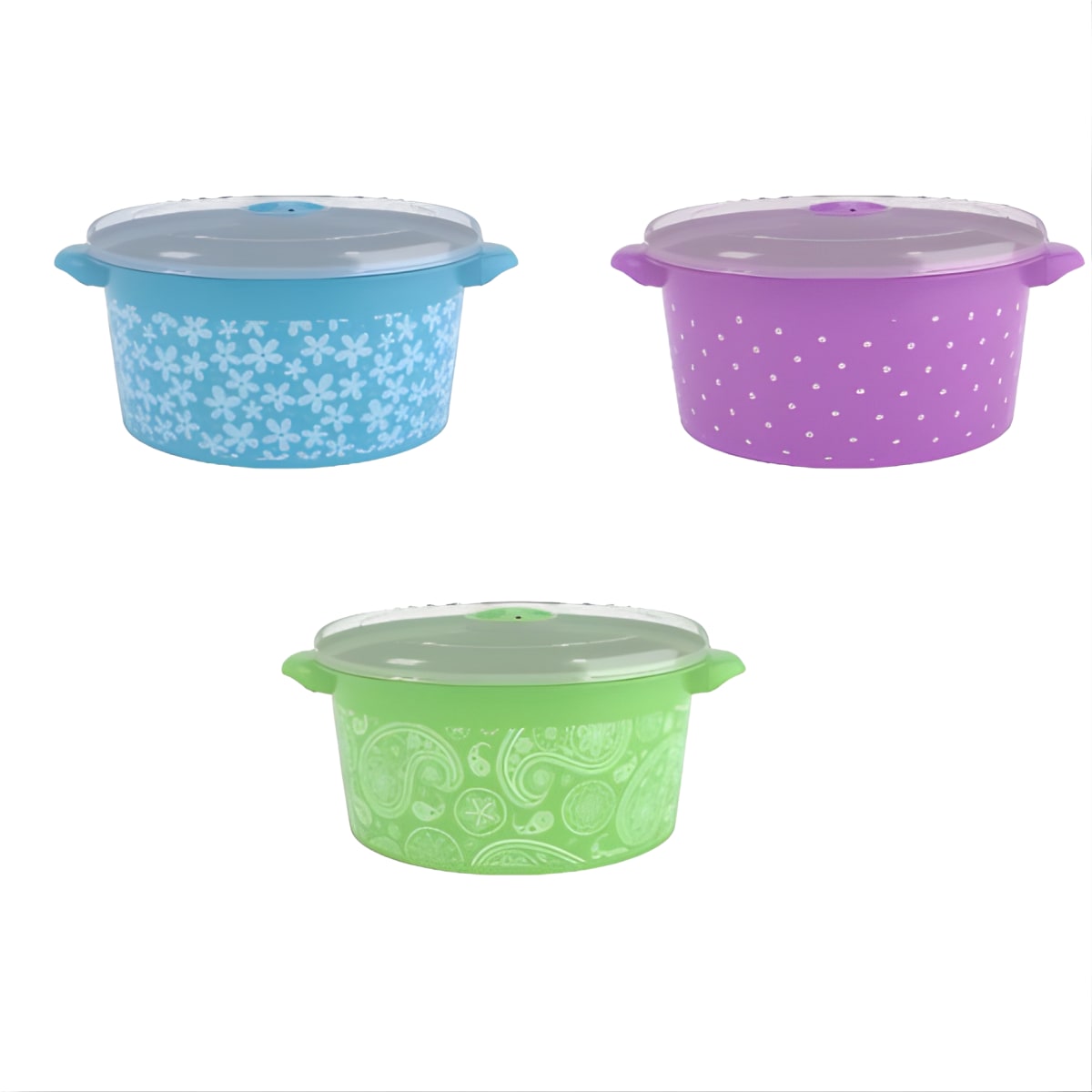 Beautifully designed plastic bowl for cooking and reheating in the microwave. It has a 3-liter capacity and features Bandana, Floral, and Polka Dot patterns that enhance every meal.