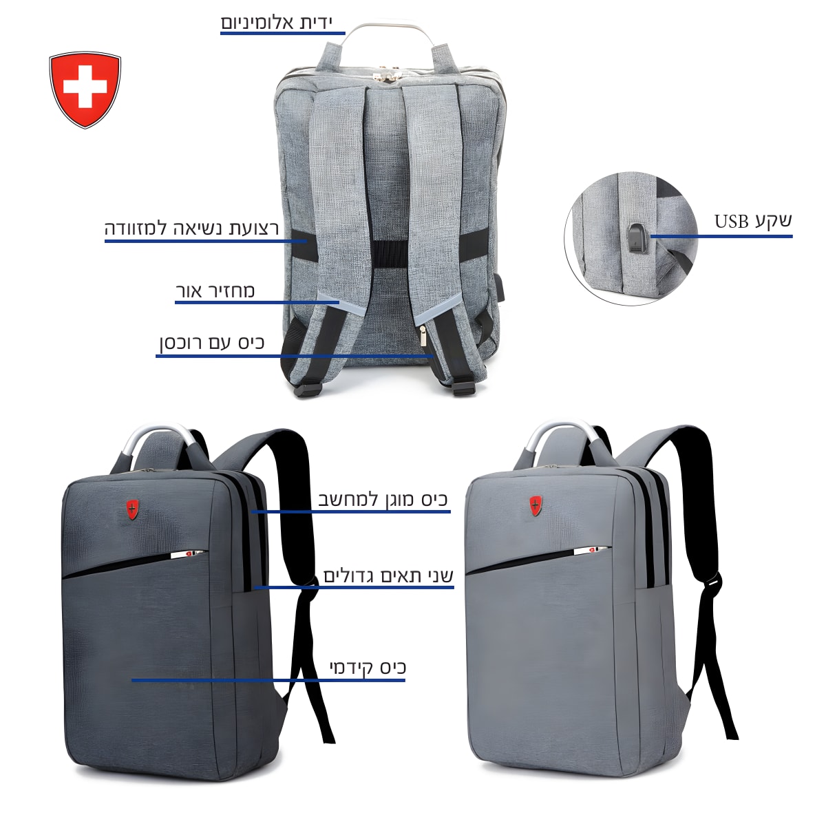 תיק גב אורטופדי עם חיבור USB למחשב נייד - מודל קאן