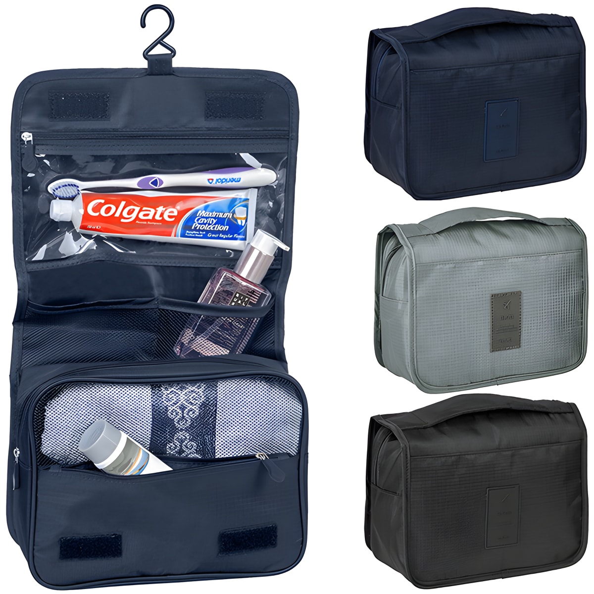 תיק כלי רחצה מתקפל עם תלייה, עמיד במים ובעל חלוקה נוחה. כולל תא מרכזי עם רוכסן מבד, תא שקוף ותאי רשת נוספים. מתאים לנשיאה בנסיעות ומגיע בצבע