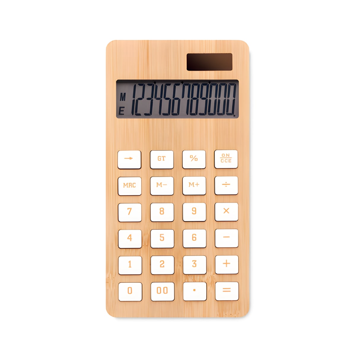 Enhance your work with this 12-digit dual power calculator encased in durable ABS with a natural bamboo finish. Includes one LR1131 cell battery. As bamboo is a natural product, slight variations in color and size may occur, potentially affecting decoration outcomes.