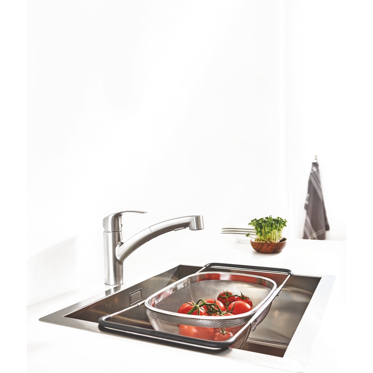 Discover the EUROSMART kitchen faucet with a pull-out spout by the German brand GROHE. Its superior chrome finish is both durable and stylis