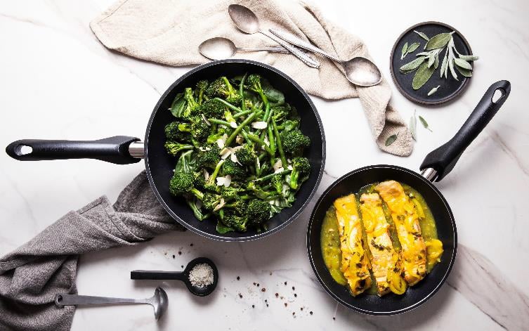Discover the premium frying pan set by Happycall, featuring two pans with revolutionary titanium coating: a 26 cm pan and a 30 cm pan. The pans are made from uniform aluminum casting and coated with a five-layer Non stick finish for perfect durability and easy cleaning.