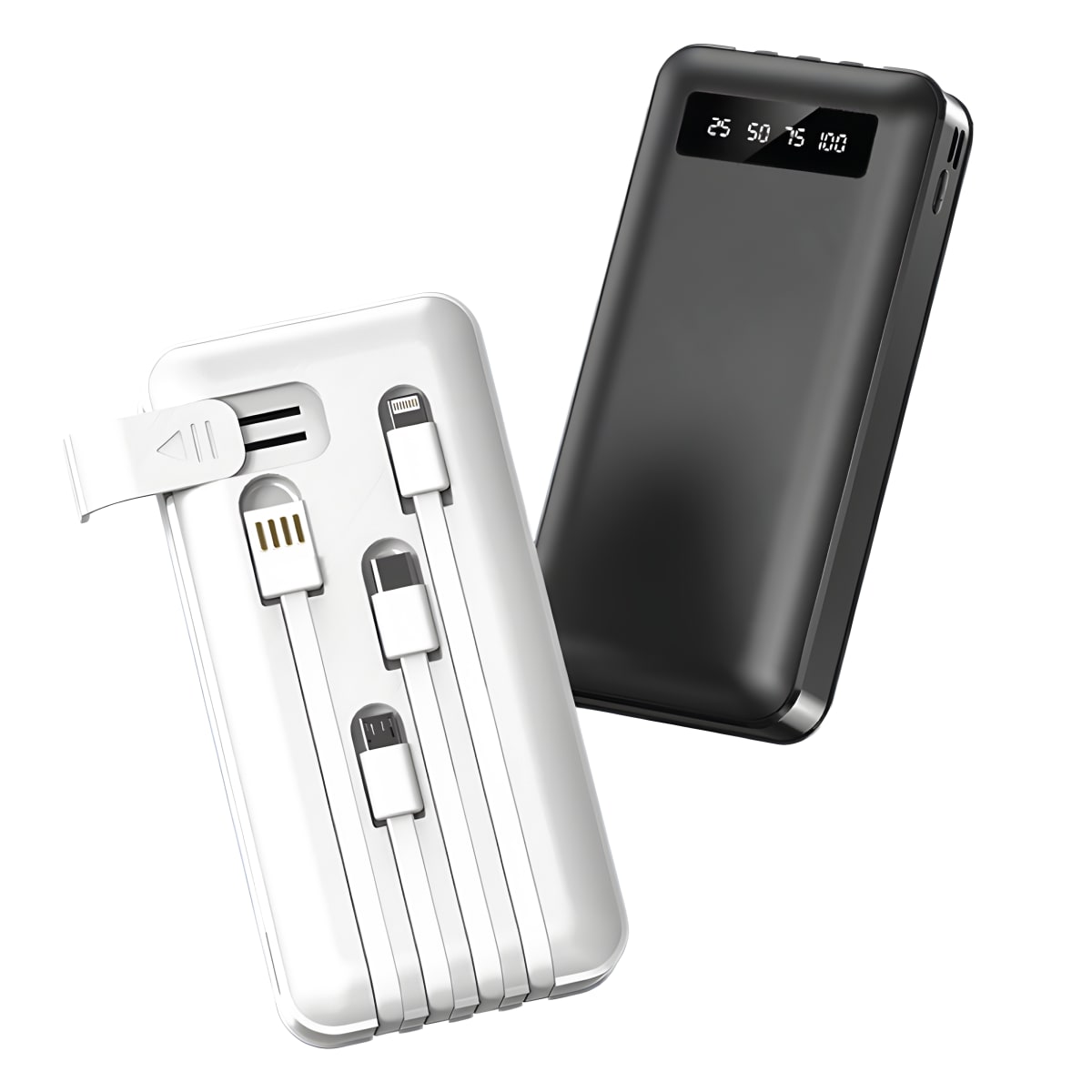Ultra-strong and portable backup battery with 10000 MAH capacity featuring four fast-charging outputs at 2.1 amperes. Includes a digital display, phone stand capability, LED light, and four built-in cables (Type-C, Lightning, Micro-USB, USB). Compatible with a wide range of mobiles and gadgets. Dimensions: 7X2X14.3 cm.